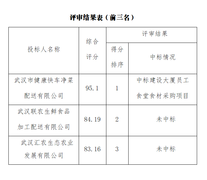 ? ? 經(jīng)評審,綜合評分排名第一為武漢市健康快車凈菜配送有限公司,綜合評分為95.1分,中標武漢市政工程設(shè)計研究院有限責任公司建設(shè)大廈員工食堂食材采購項目。