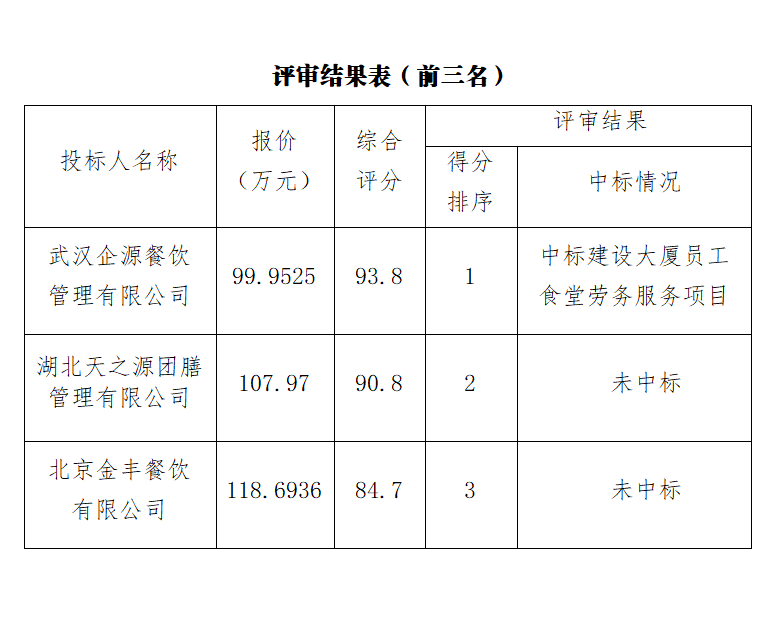 ? ? 經(jīng)評審,綜合評分排名第一為武漢企源餐飲管理有限公司,報價為99.9525萬元/年,綜合評分為93.8分,中標(biāo)武漢市政工程設(shè)計研究院有限責(zé)任公司建設(shè)大廈員工食堂勞務(wù)服務(wù)項目。