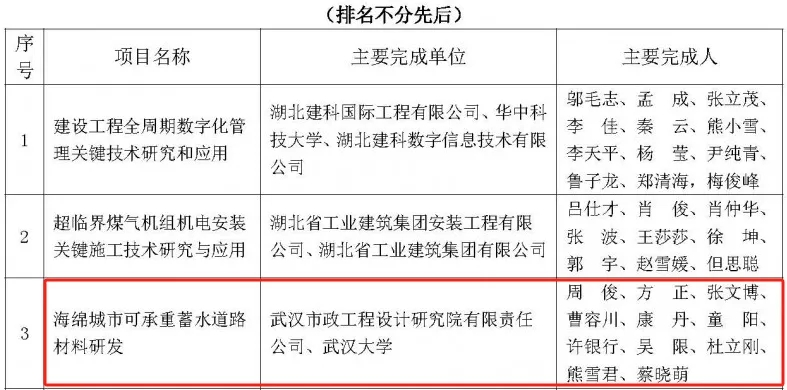 近日,湖北省土木建筑學會公布第五屆湖北省土木建筑科學技術(shù)獎獲獎名單,由武漢市政院牽頭、武漢大學共同參與的《海綿城市可承重蓄水道路材料研發(fā)》科研項目榮獲二等獎。