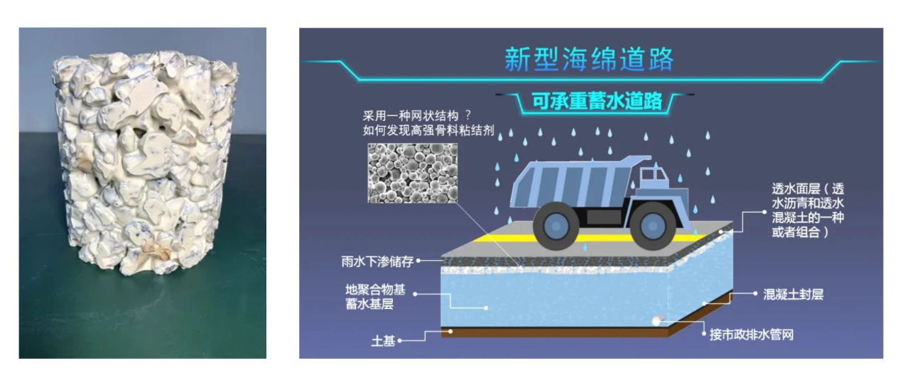 本次獲獎的《海綿城市可承重蓄水道路材料研發(fā)》科研項目打破了傳統(tǒng)的要求道路基層嚴格防水的固有思維局限,首次且極具創(chuàng)造性地提出了利用高空隙率的道路基層作為蓄水空間的可承重蓄水道路的新理念。依照這種新的理念,項目團隊制定了嶄新的研究思路并成功開發(fā)出了一種具有高強度、高粘結(jié)特性的新型地聚合物凝膠材料,利用該凝膠材料包覆開級配骨料表面能夠?qū)⒋止橇侠喂痰卣辰Y(jié)在一起,可形成具備高強度和高空隙率的蜂窩狀空間結(jié)構(gòu)凝聚體路基材料,從而能夠在保證路基結(jié)構(gòu)整體強度的同時,實現(xiàn)高效的道路基層蓄水功能,有利于緩解城市內(nèi)澇,達到海綿城市可承重蓄水道路建設(shè)的要求,同時也為大幅提升城市地下空間有效利用率提供了新的可能性。在該項目開展成果評價時,評價專家委員會也一致認為項目研究成果達到了國內(nèi)領(lǐng)先水平。