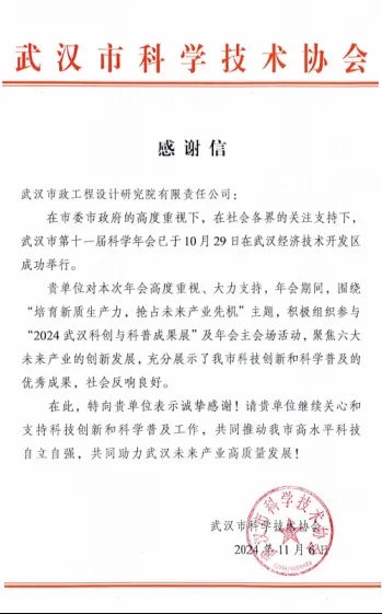 ? ? 在年會上,武漢市政院展示了近年來在科技創(chuàng)新和科學普及方面取得的成果,贏得了武漢市科協(xié)的高度贊譽,特此發(fā)來感謝信,對雙方在科技領域的攜手合作予以充分肯定,并期待未來繼續(xù)并肩前行,共同書寫科技進步與城市發(fā)展的新篇章。