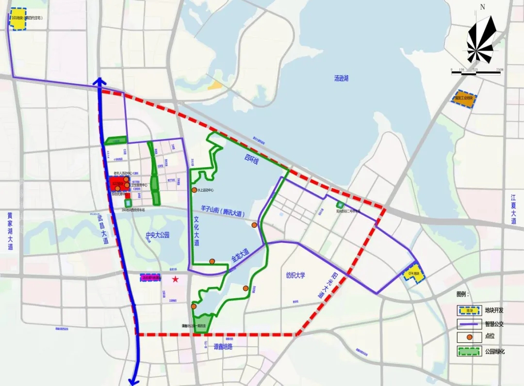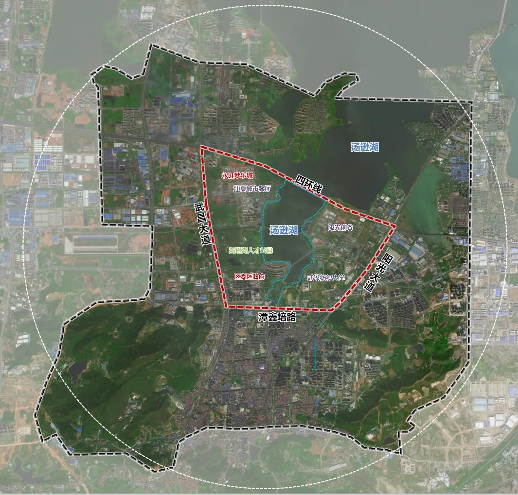 項(xiàng)目核心區(qū)范圍北起四環(huán)線,南抵譚鑫培路,西至武昌大道,東達(dá)陽光大道,規(guī)劃區(qū)域面積10.65㎞²(含水域2.2㎞²),研究范圍更延伸至區(qū)界、廟山大道、紙坊大街、黃家湖大道及區(qū)界圍合形成的廣闊區(qū)域。