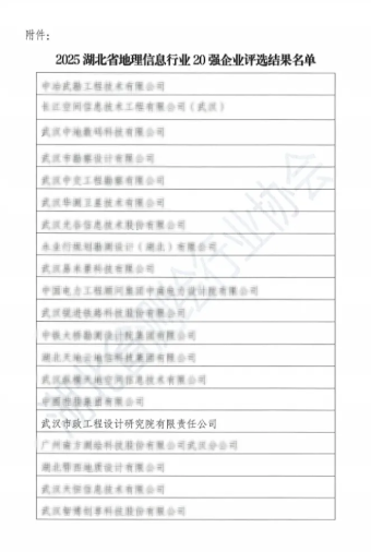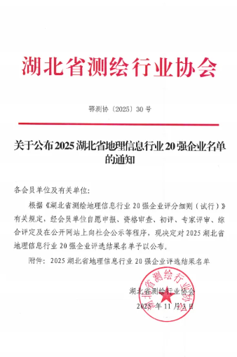 近日,從湖北省測繪行業(yè)協會傳來喜訊,武漢市政院憑借卓越的技術實力與行業(yè)貢獻,成功獲評“2025湖北省地理信息行業(yè)20強”。這一榮譽標志著公司在測繪地理信息領域的專業(yè)能力獲得省級權威認可,為企業(yè)發(fā)展里程碑再添濃墨重彩。