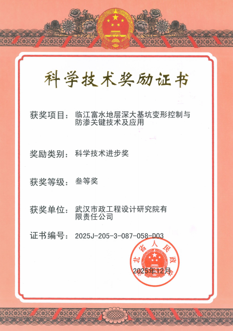 近日,2025年度湖北省科學(xué)技術(shù)獎獲獎名單正式公布。由武漢市政院深度參與研發(fā)的科研項目“臨江富水地層深大基坑變形控制與防滲關(guān)鍵技術(shù)及應(yīng)用”,憑借顯著的技術(shù)創(chuàng)新性與突出的工程應(yīng)用價值,榮獲湖北省科學(xué)技術(shù)進(jìn)步三等獎。
