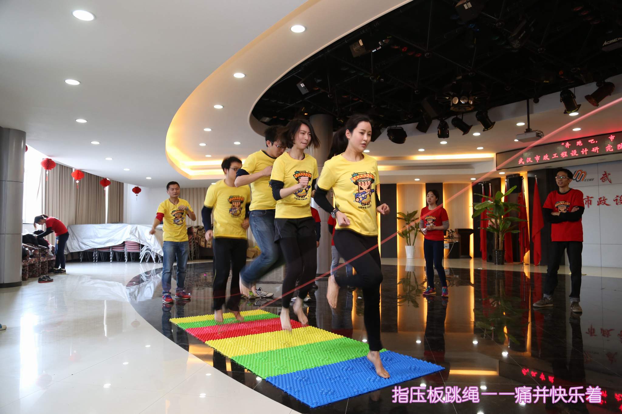 ??? 第三個環(huán)節(jié)是指壓板跳繩,每隊兩名隊員負(fù)責(zé)搖繩,四名隊員赤腳在指壓板上跳繩,四人同時完成10個用時最少的隊伍勝出。隊員們克服了指壓板帶來的疼痛,都圓滿的完成了比賽任務(wù),而綠隊再次以用時最少勝出,再次獲得一個錦囊。