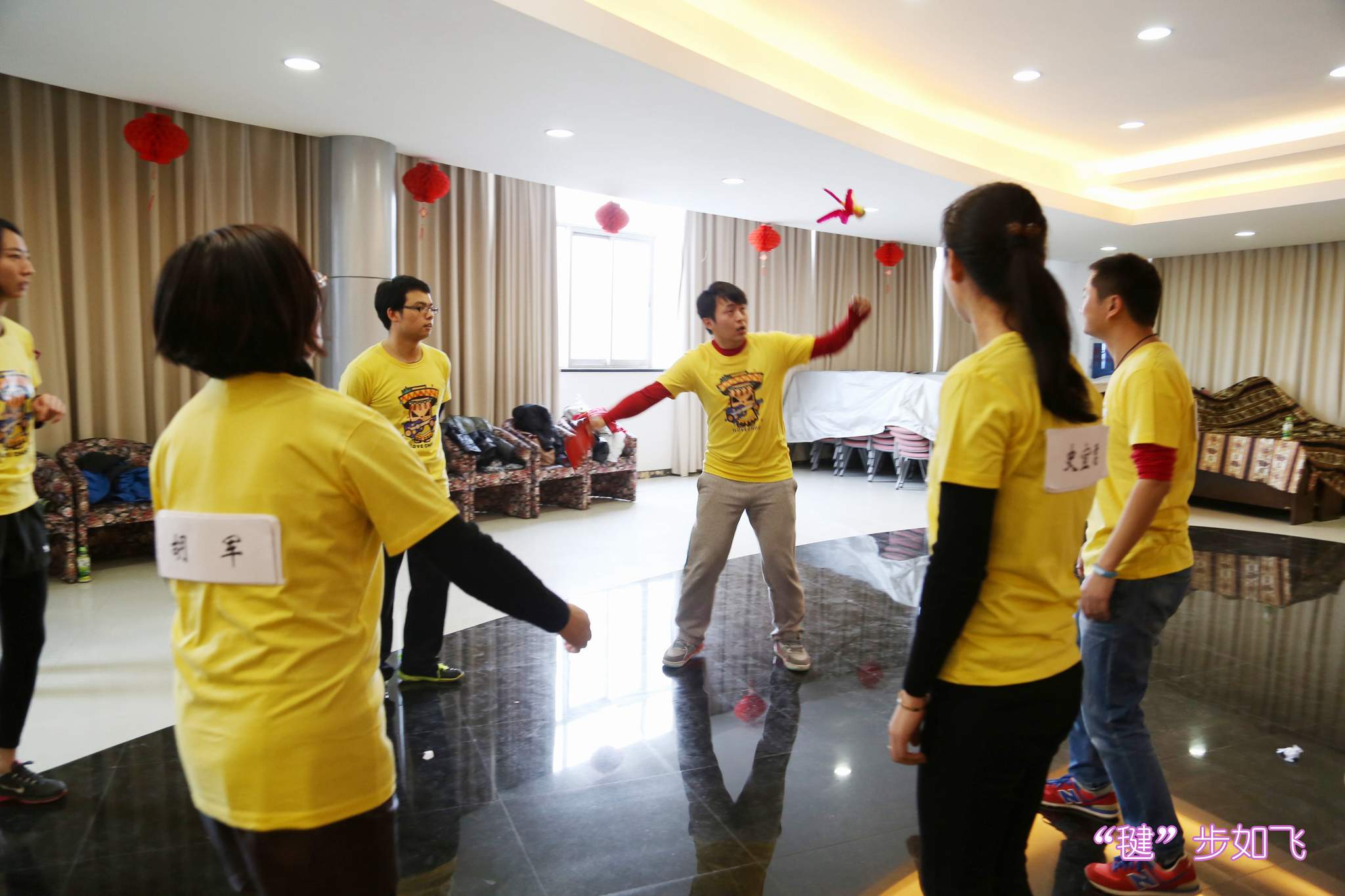 ??? 第五個環(huán)節(jié)是踢毽子,七名隊員要讓毽子在本隊中進(jìn)行15次傳接,單人連續(xù)多次踢毽子只算作1次,至少有3名隊員要踢到毽子,這也是所有游戲環(huán)節(jié)中難度最大的一個,有的隊伍在傳接了14次后沒有接好最后一次,功敗垂成。最終,黃隊首先完成,成功獲得1個錦囊。