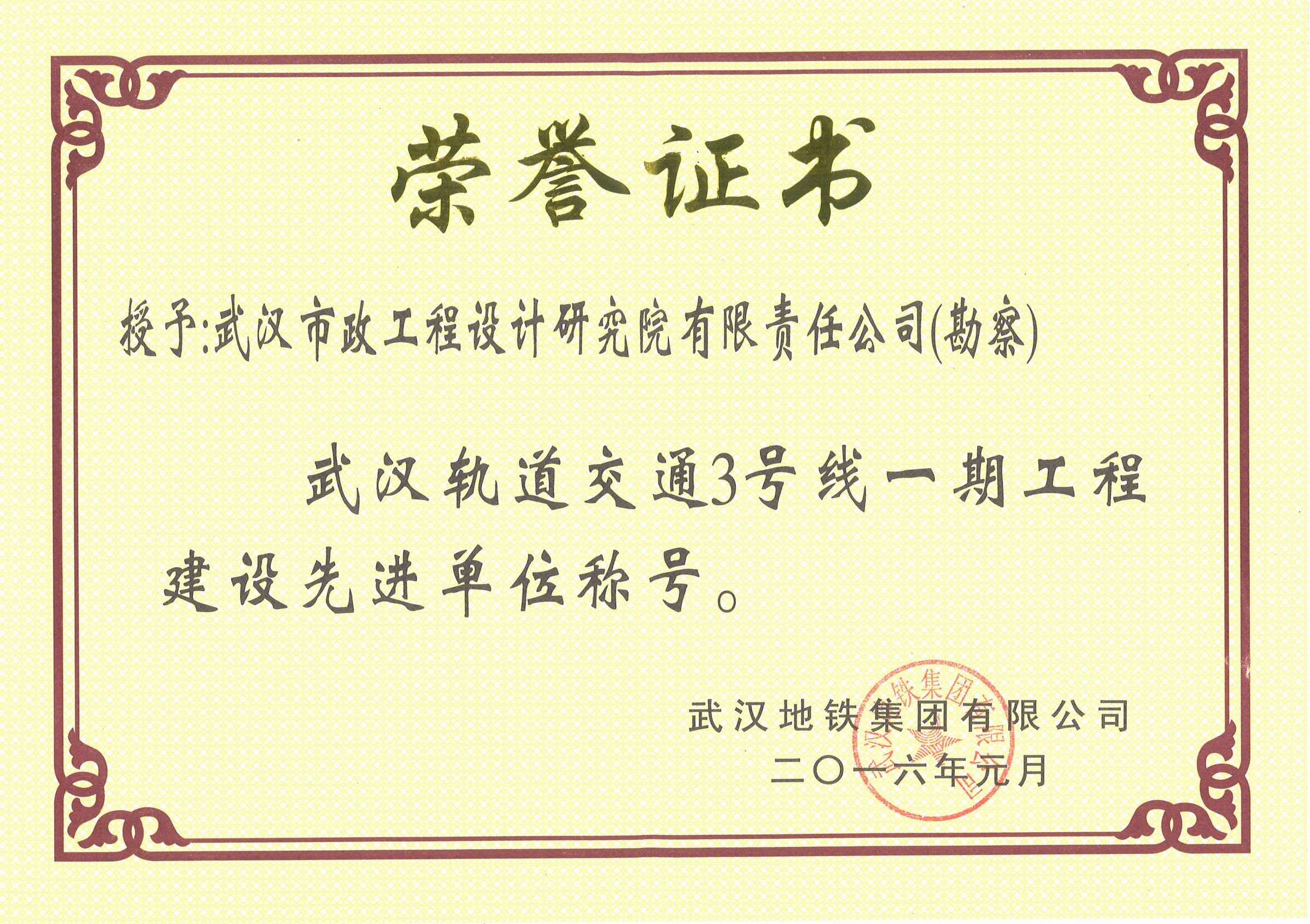 ??? 近日,武漢地鐵集團有限公司頒發(fā)文件,表彰一批在武漢軌道交通三號線一期工程建設中表現(xiàn)優(yōu)異的先進單位。公司由于參與并圓滿完成了三號線一期工程的勘察及部分站點和區(qū)間的設計工作,榮獲“先進單位”榮譽稱號。