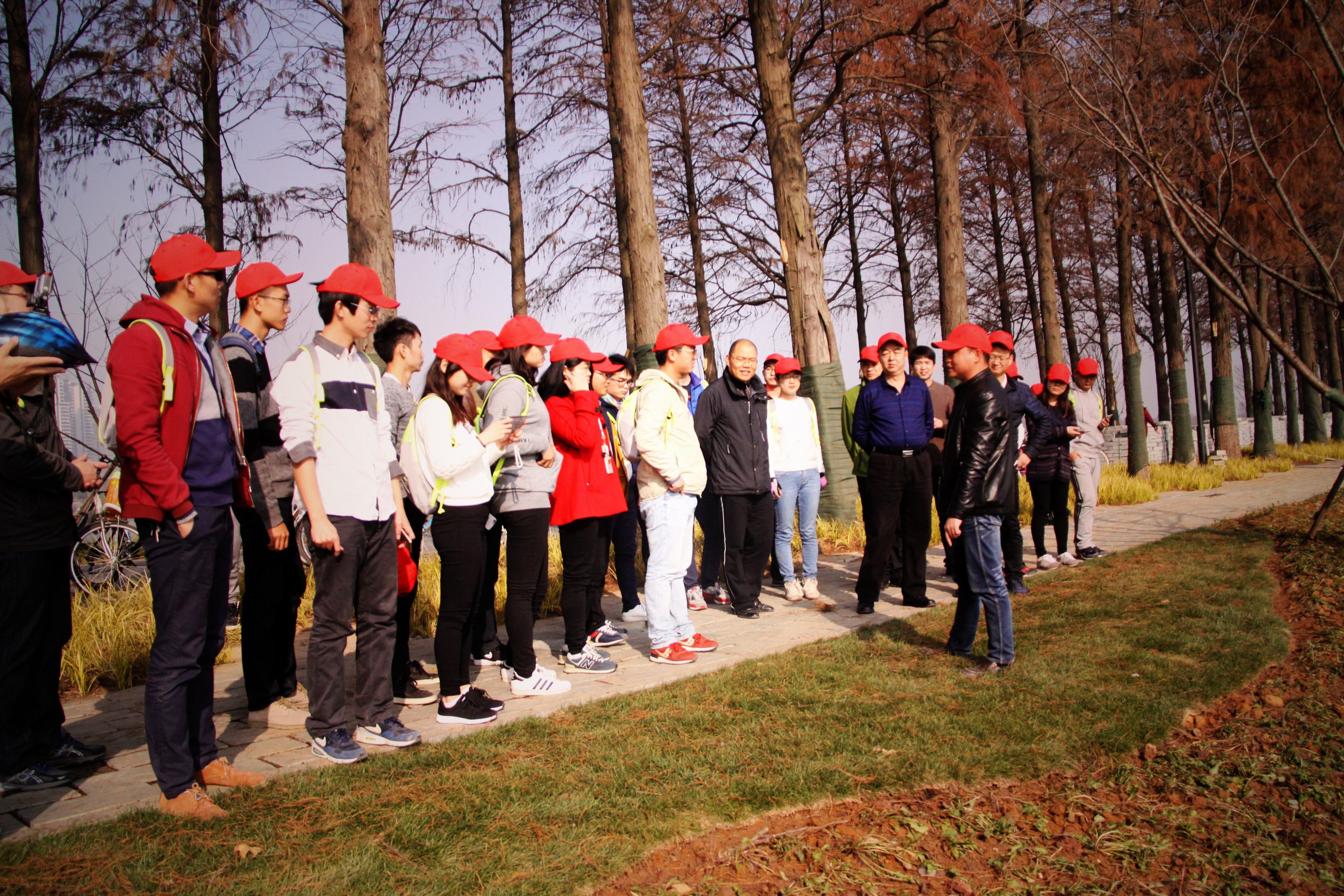 ??? 在景觀專業(yè)副總工程師彭鐘的引導(dǎo)下,參觀隊伍自梨園廣場出發(fā),沿東湖綠道騎行,并在湖心島、鵝咀、塘野蛙鳴等重要景觀節(jié)點駐足參觀,聽取該項目在景觀布置、意境營造等方面的獨特創(chuàng)意。