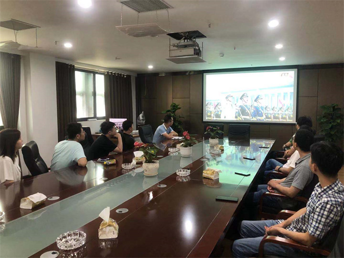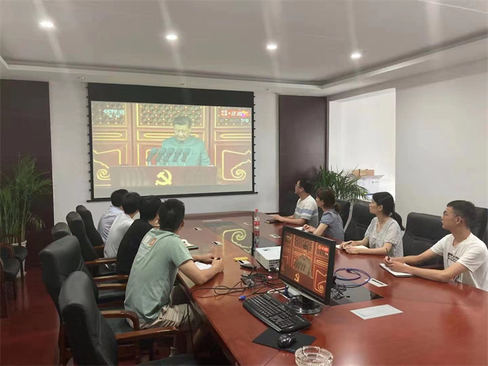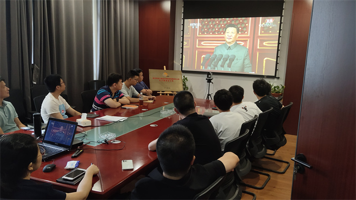 公司領導、總經理助理、駐總院辦公的部門負責人、支部書記在西四樓會議室集中收看大會盛況。大會伊始,在轟鳴的禮炮聲中,國旗護衛(wèi)隊護衛(wèi)國旗颯爽登場;全場肅立高唱《國歌》,高亢的旋律瞬間營造了莊嚴肅穆的氛圍;少先隊員和共青團聯(lián)合獻詞,回顧黨的光輝歷史,表達對黨的熱愛與忠誠。大會現場氣氛莊嚴,激昂奮進,讓收看的人仿佛置身現場,親臨盛典。